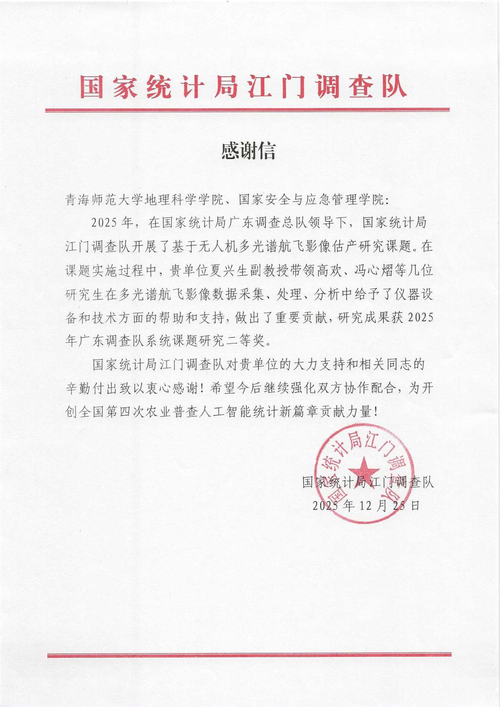 国家统计局江门调查队致我院的感谢信
